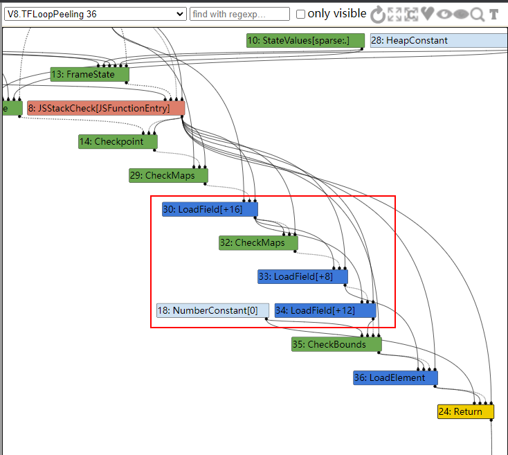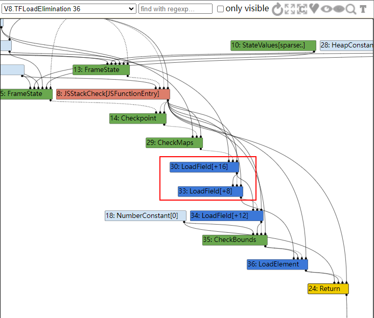 仔细对比后发现,在 v8.TFLoadElimination 阶段,阻碍漏洞利用的 CheckMaps 节点被删除了。